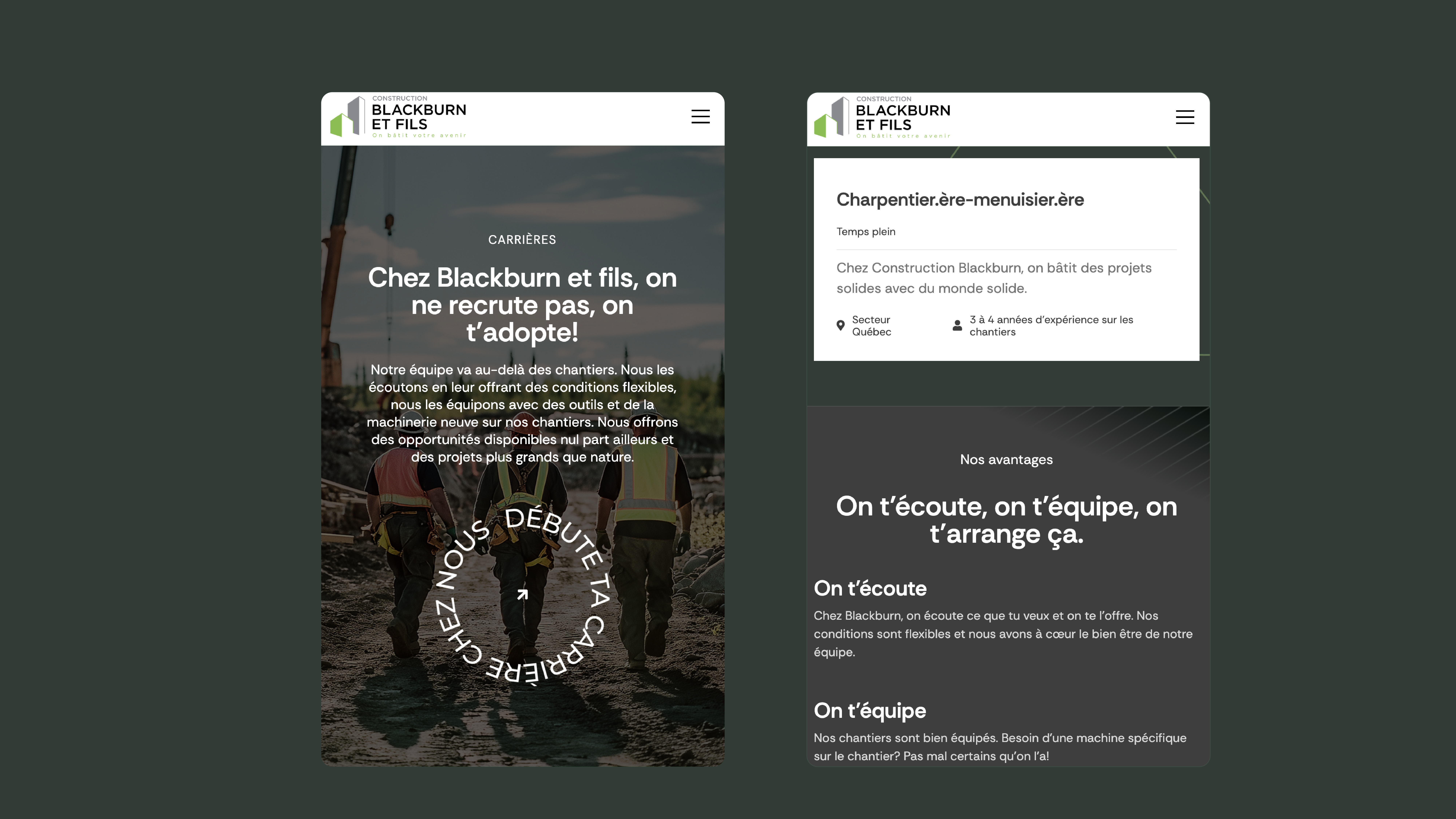 Une marque incarnée dans un sentiment d’appartenance fort, où chaque employé fait partie de quelque chose de plus grand quʼune compagnie de construction. La fraternité s’étend au-delà de nos chantiers, l’entreprise offre un environnement uni, où tout le monde se tient et où rien n’est laissé au hasard. Parce qu’on ne te recrute pas, on t’adopte.